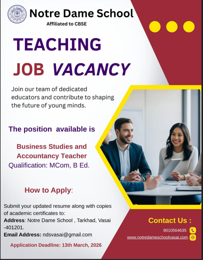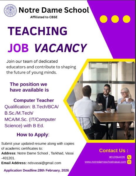 Notre Dame School , Vasai is a Catholic institution founded in June ,2004. Notre Dame School Prepares students for the CBSE Examination (Central Board of Secondary Education-All India). English is the medium of instruction. Marathi and Hindi are taught as second languages.